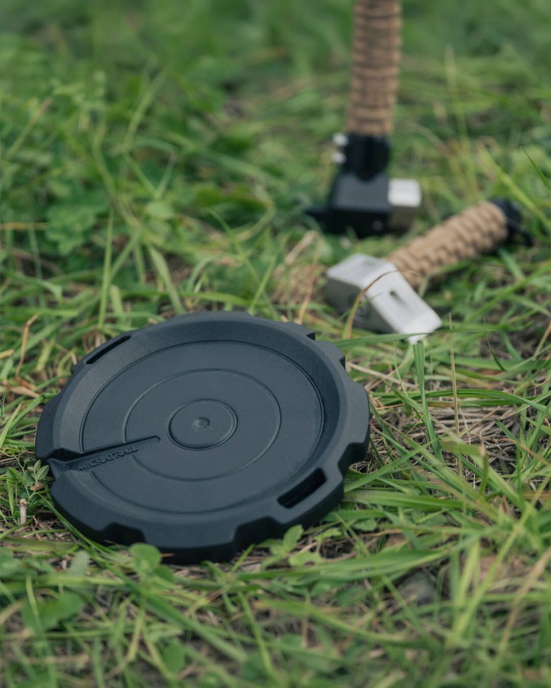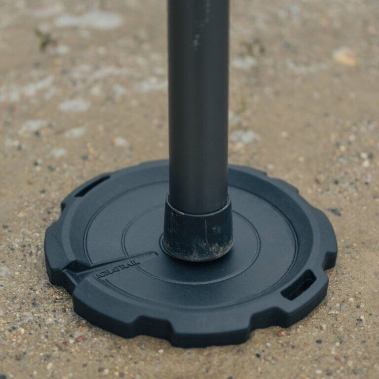 悪天候時や砂利などの場所でタープポールが安定しないとき、スタンドをポールの下に敷くことで先端が地面に埋まるのを防ぎます。